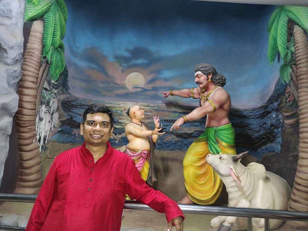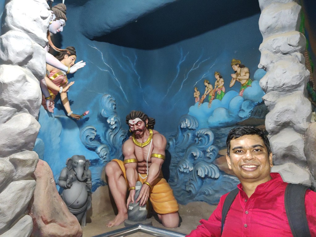 Next day 27-Mar-22 was our last day in Murdeshwar. Waking up before 06:30 AM I went to temple to avoid the weekend rush. The premises was deserted and I could see all the shrines and views at leisurely pace. I was intrigued to see an entrance to the Bhukailasa caves and I went in. There are wonderful statuettes and life size images depicting various stories from Puranas. The legend of Gokarna is a special attraction here.